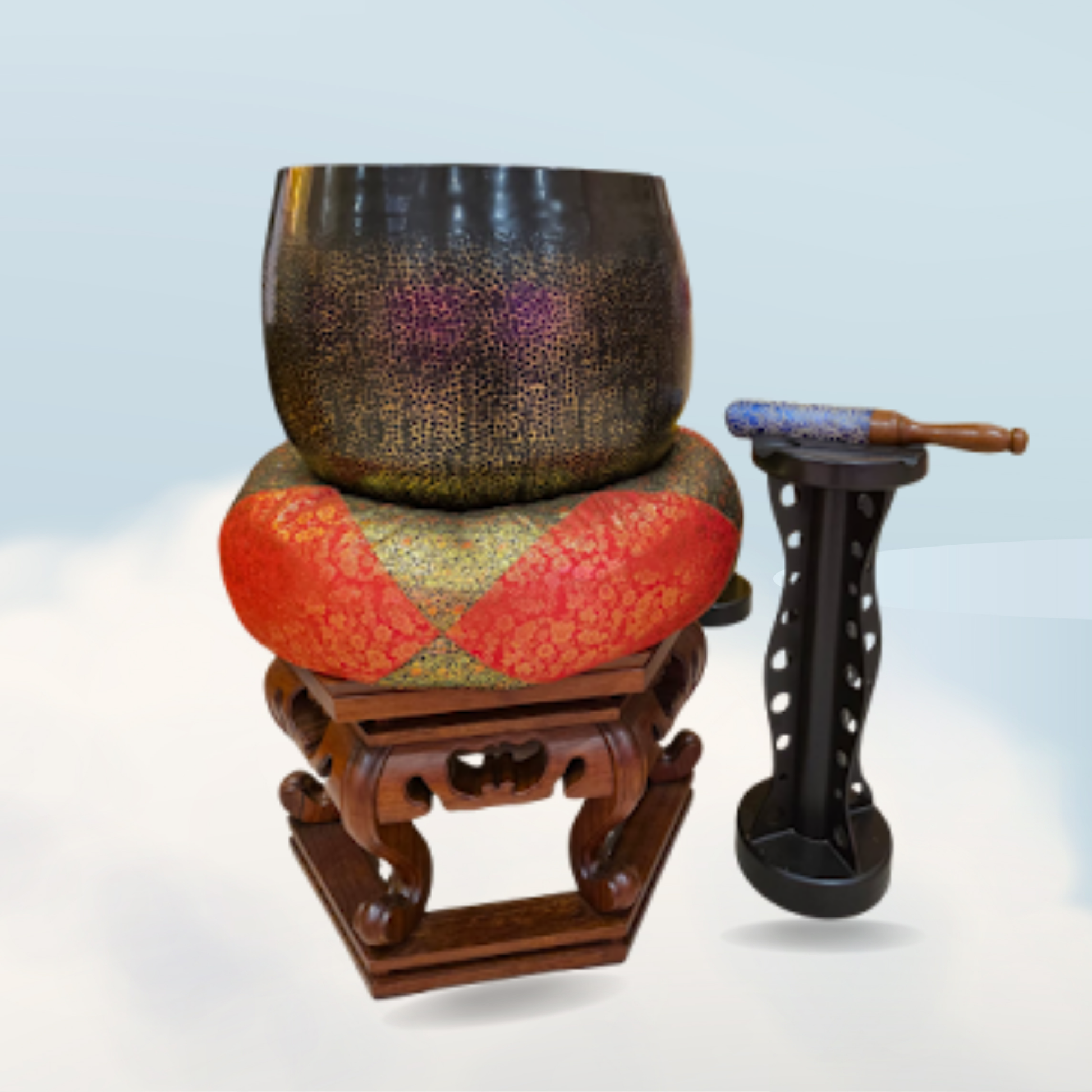 Cast by a specialized high-quality bell foundry in Taiwan. The large bell is made of thickened new bronze, with a diameter of 56cm, producing a clear and resonant sound. It comes with an exquisite wooden base and padded cushion.