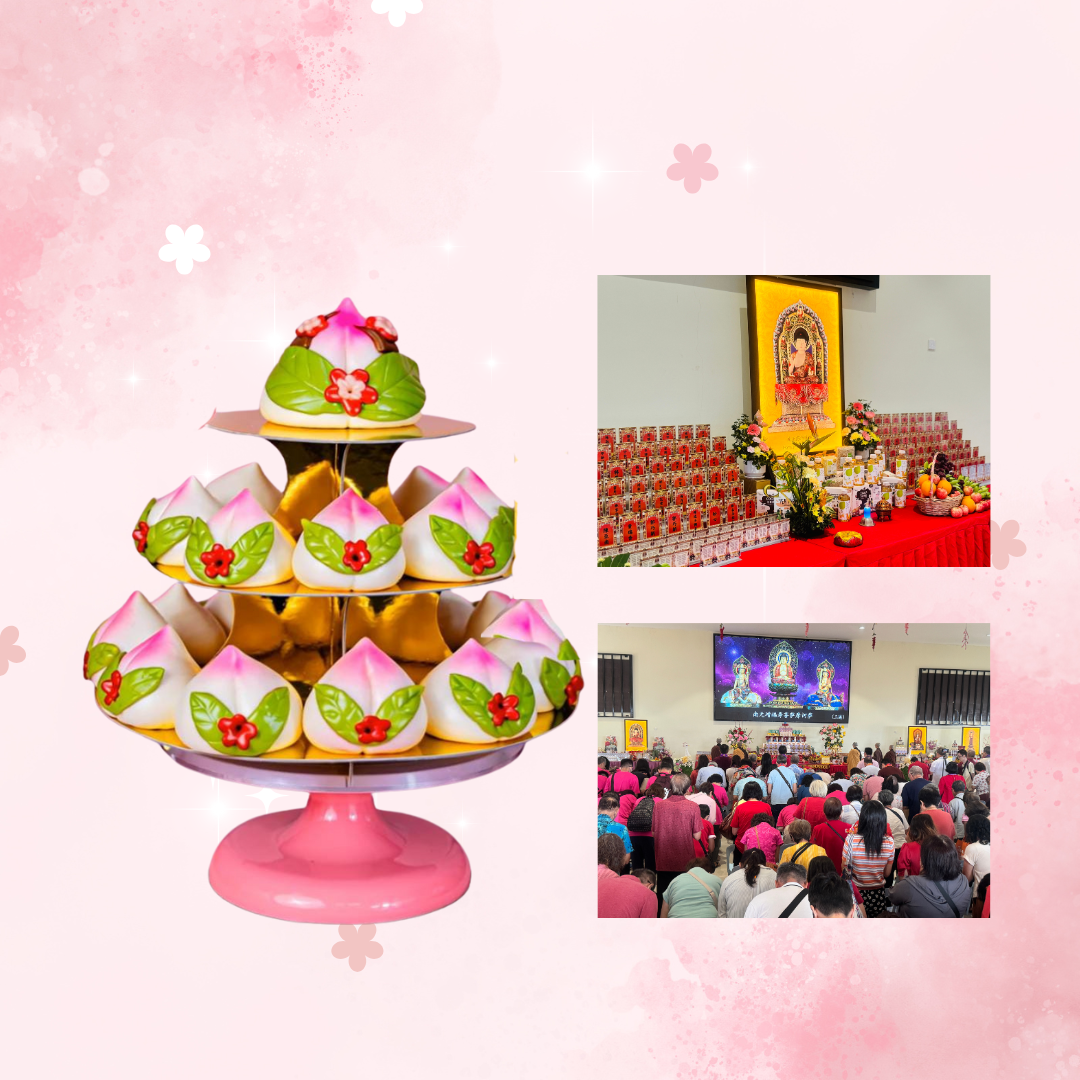 🪔 寺院为施主特献上大方宏伟的吉祥寿桃塔,为观音菩萨圣诞及药师琉璃光如来圣诞祝福祈寿,愿施主福寿绵长,家族和乐美满。